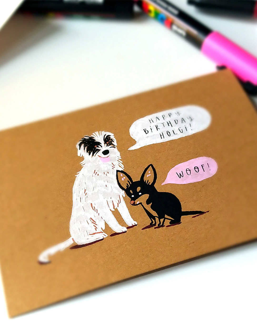 In 2019 I was invited to an event by Etsy Germany where I originally gave a little visitors’ workshop on how to design your own holiday cards with acrylic markers. But once people noticed my love for drawing animals, guests began approaching me with photos of their pets – and what followed was a stream of spontaneous portraits!