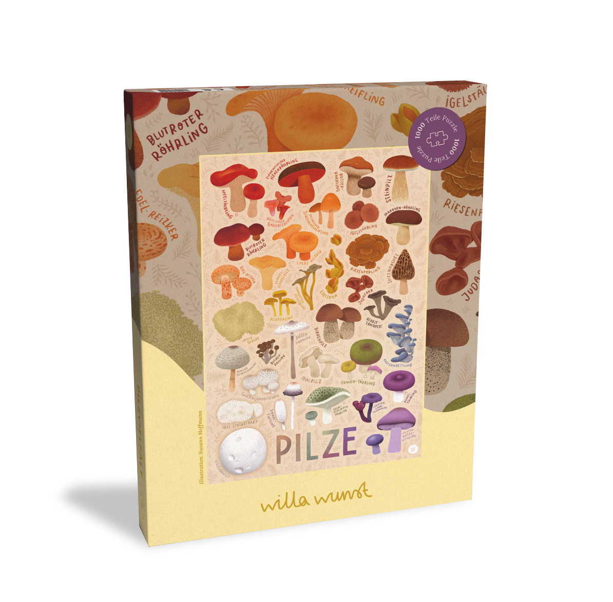To make the puzzle more engaging – especially given that large monochrome areas can be challenging – we incorporated the names of the mushrooms along with floral elements into the background.