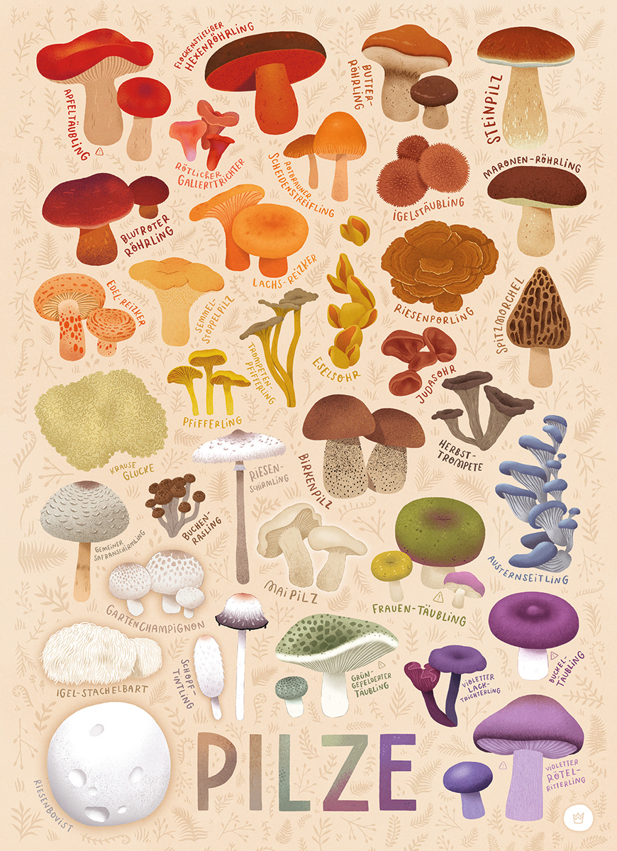 FUNGI is the sixth jigsaw puzzle motif I created for the puzzle company WillaWunst. The main challenge was selecting which fungi to feature. Rather than creating a safe guide to mushroom foraging, the goal was to spark curiosity and encourage people to explore the topic while celebrating nature’s vibrant diversity.